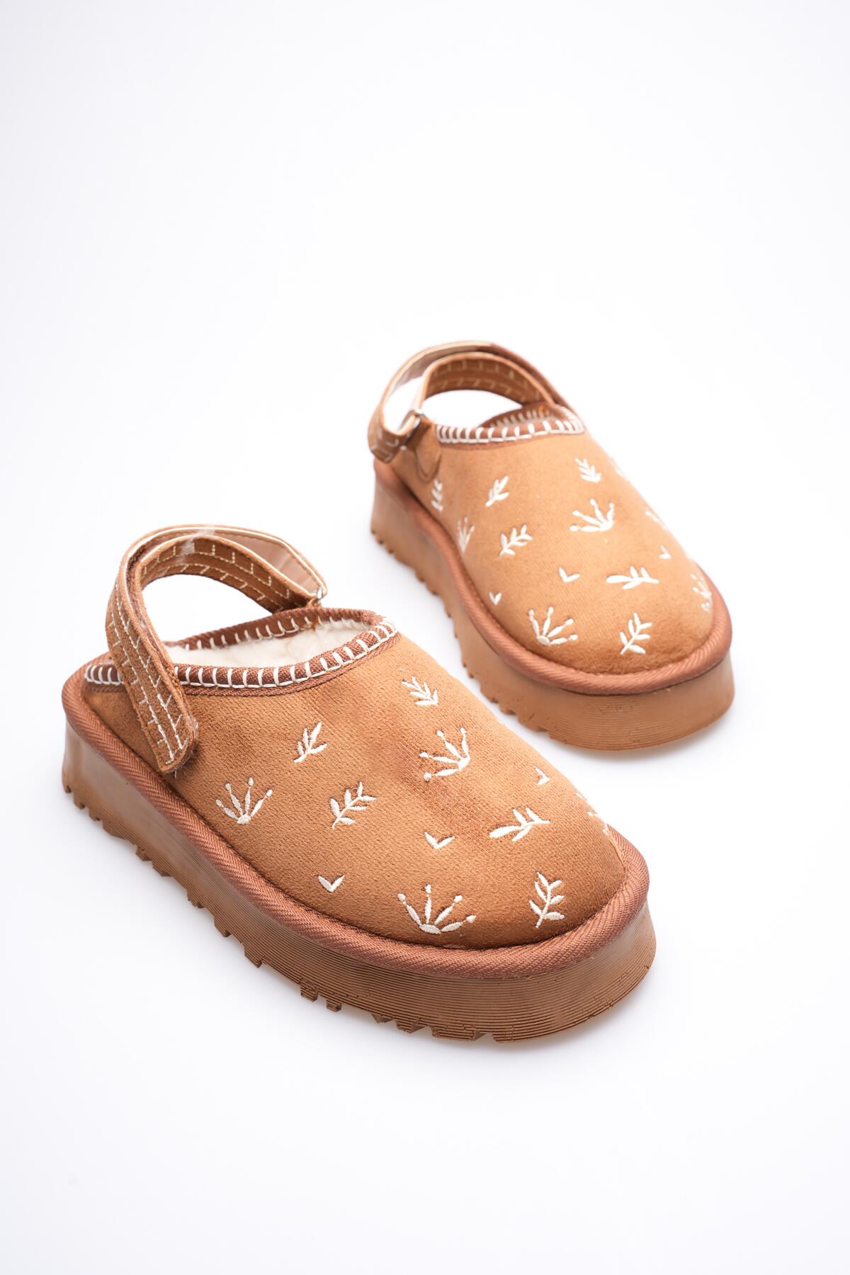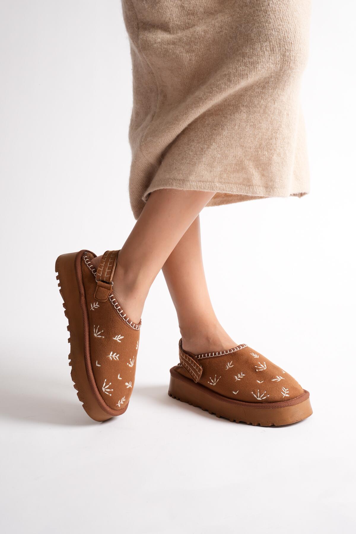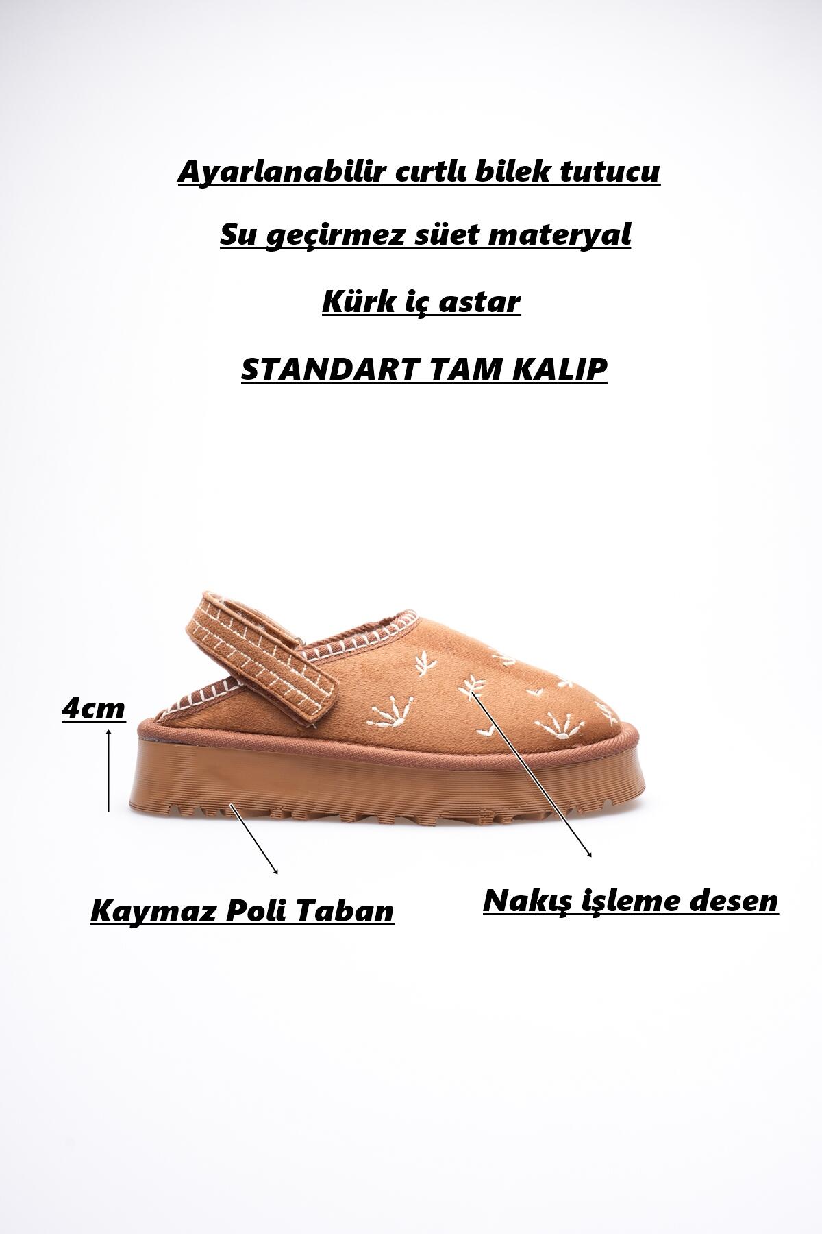 Içı Kürklü Nakişli Ultra Mini Süet Kışlık Taban Bot & Bootie Taba