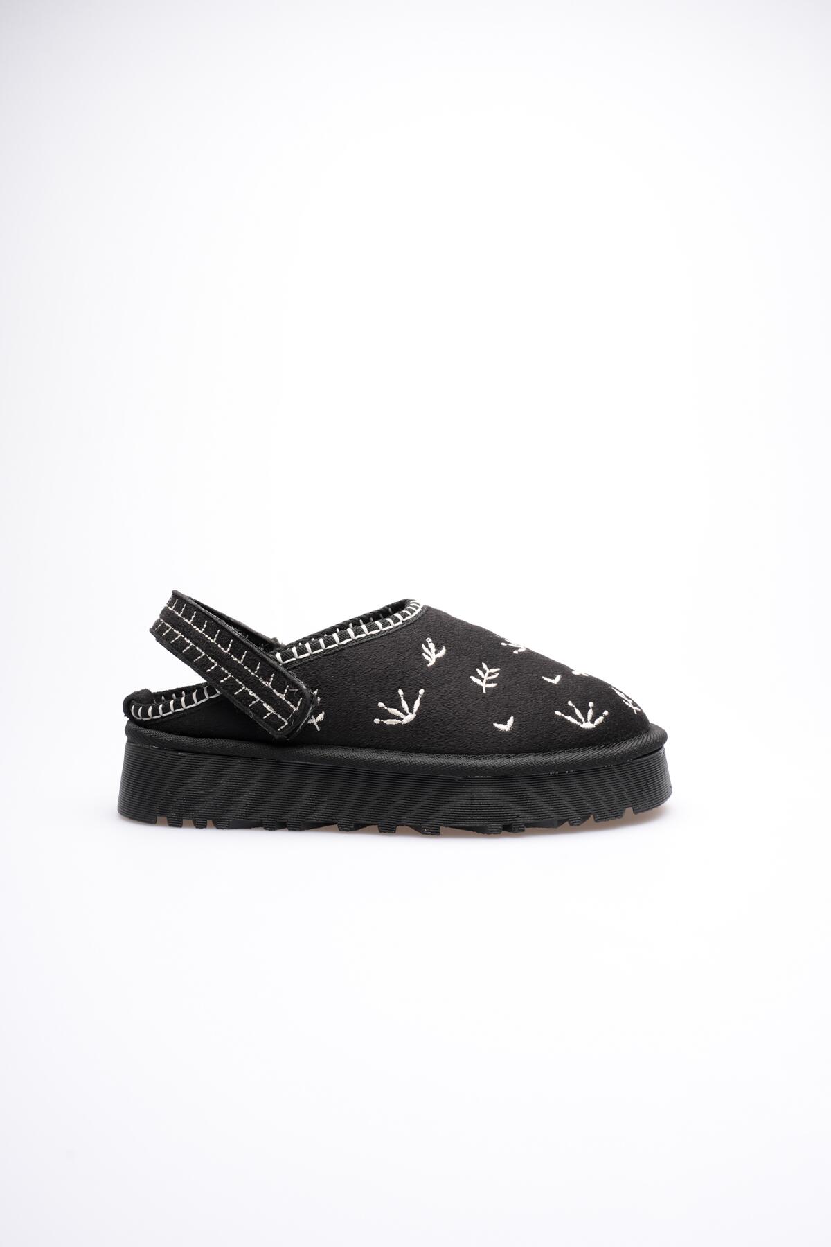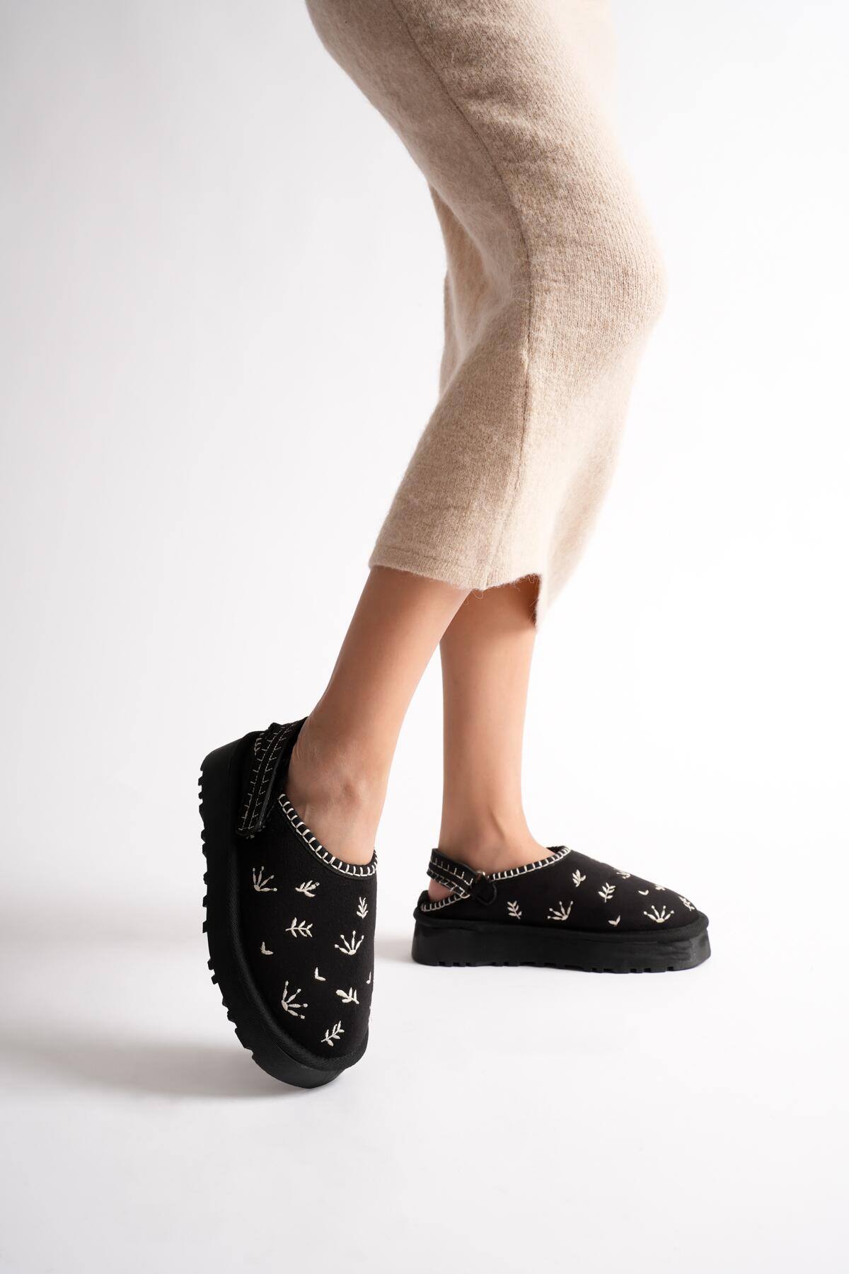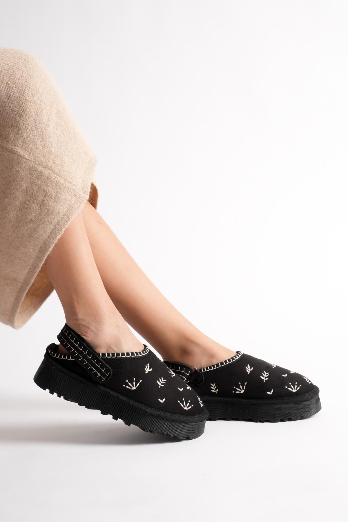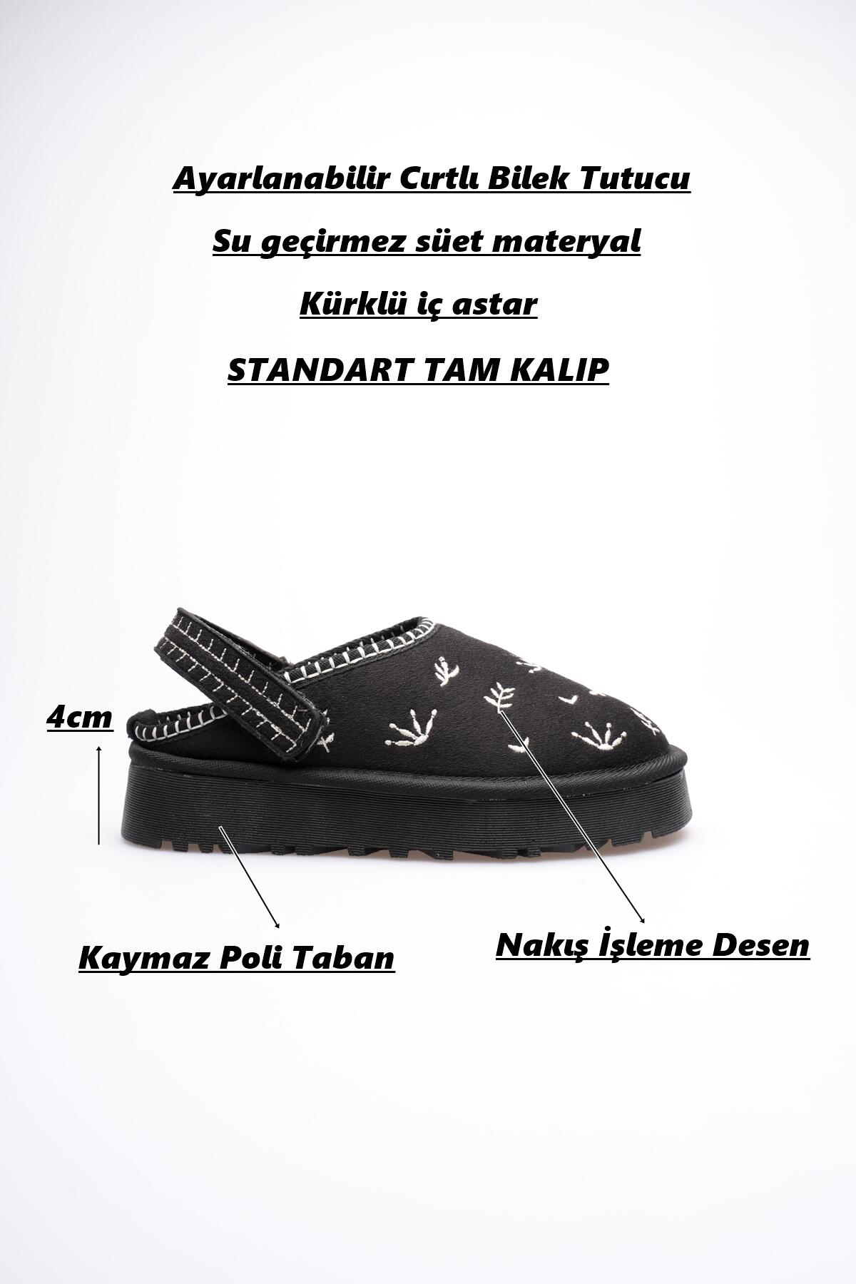 Içı Kürklü Nakişli Ultra Mini Süet Kışlık Taban Bot & Bootie Siyah