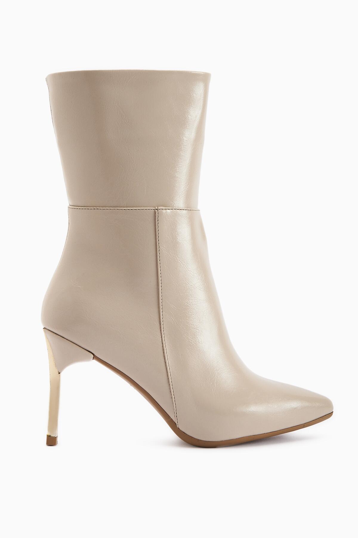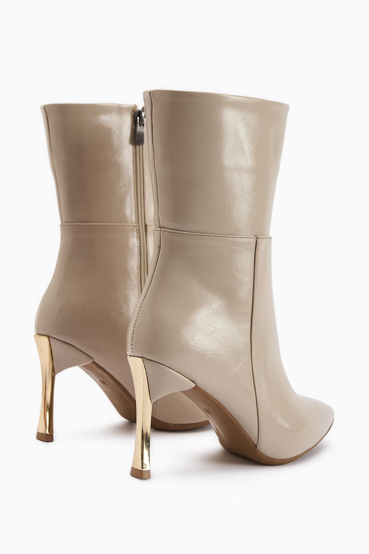 Sivri Burun İnce Altin Topuklu Kisa Çizme Bej