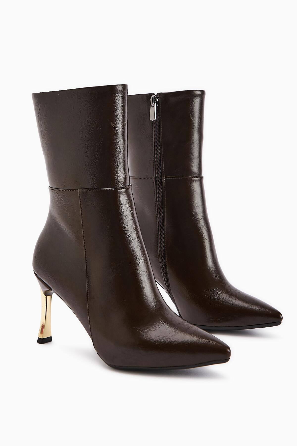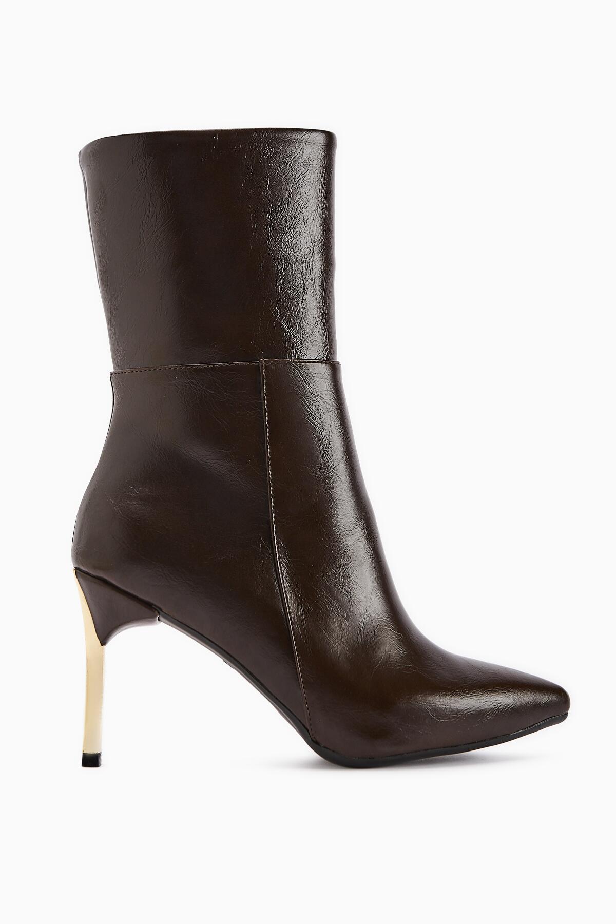 Sivri Burun İnce Altin Topuklu Kisa Çizme Koyu Kahverengi