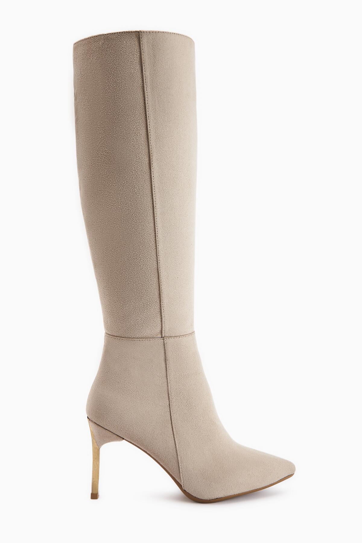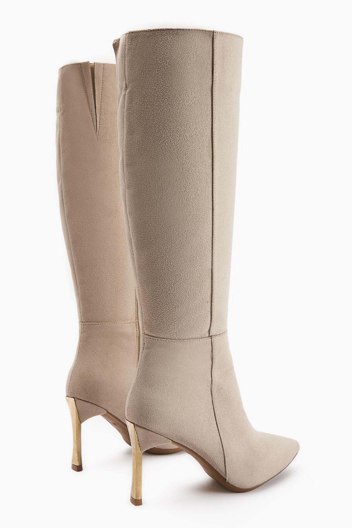Kadın Fermuarlı Diz Altı Boy Altin Topuklu Çizme Bej