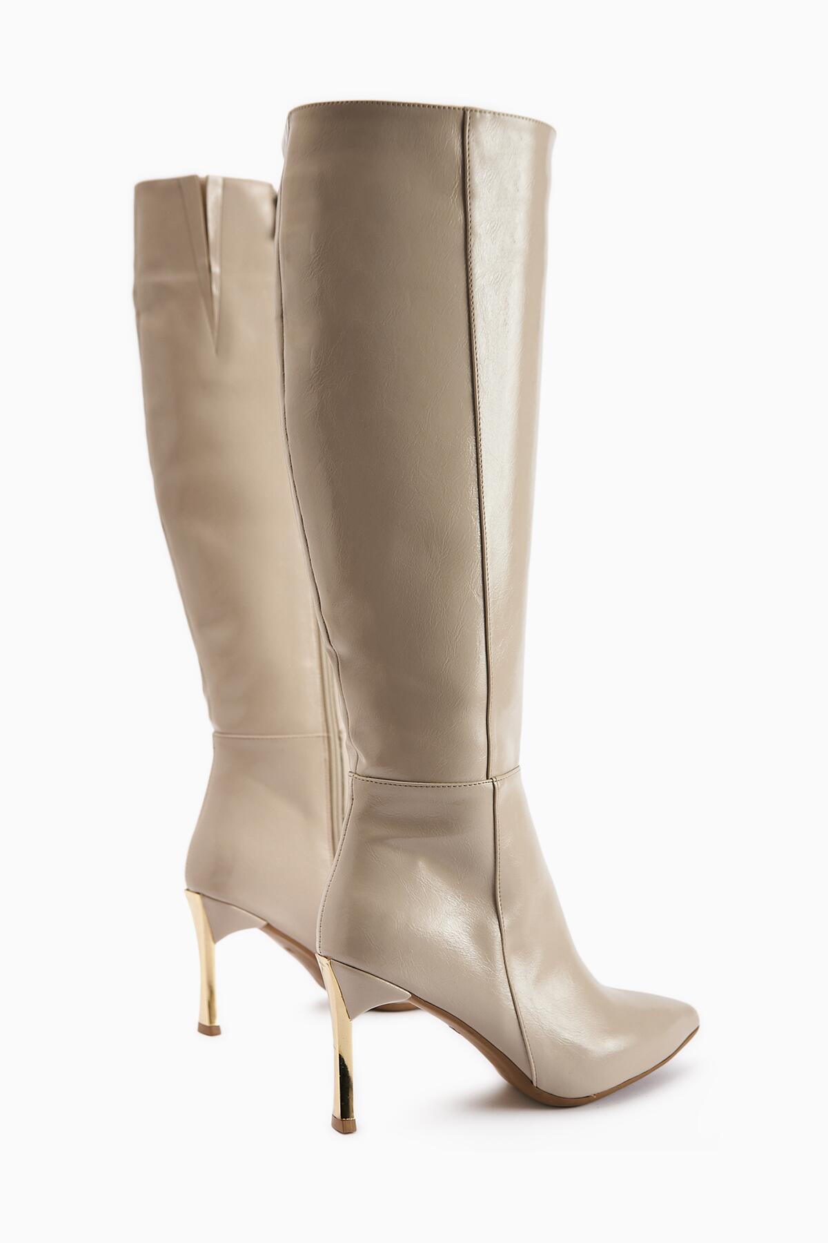 Kadın Fermuarlı Diz Altı Boy Altin Topuklu Çizme Bej