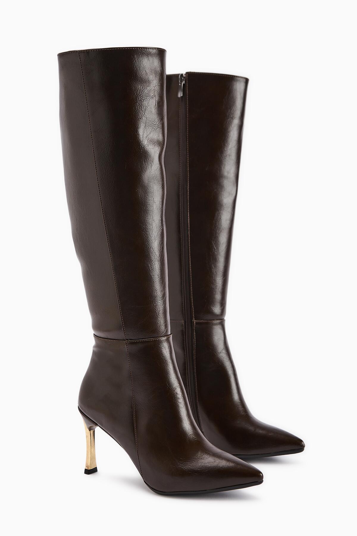 Kadın Fermuarlı Diz Altı Boy Altin Topuklu Çizme Koyu Kahverengi