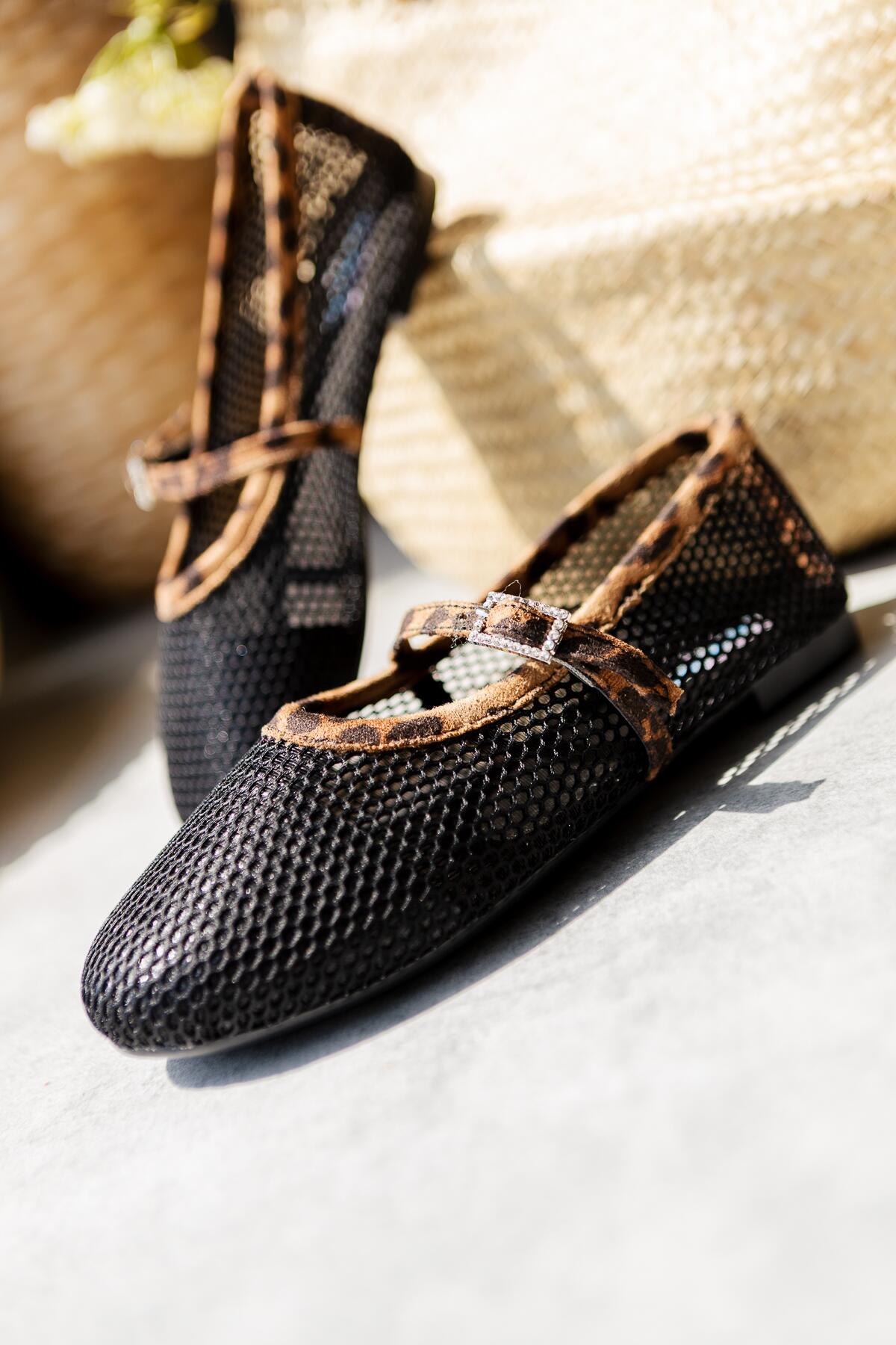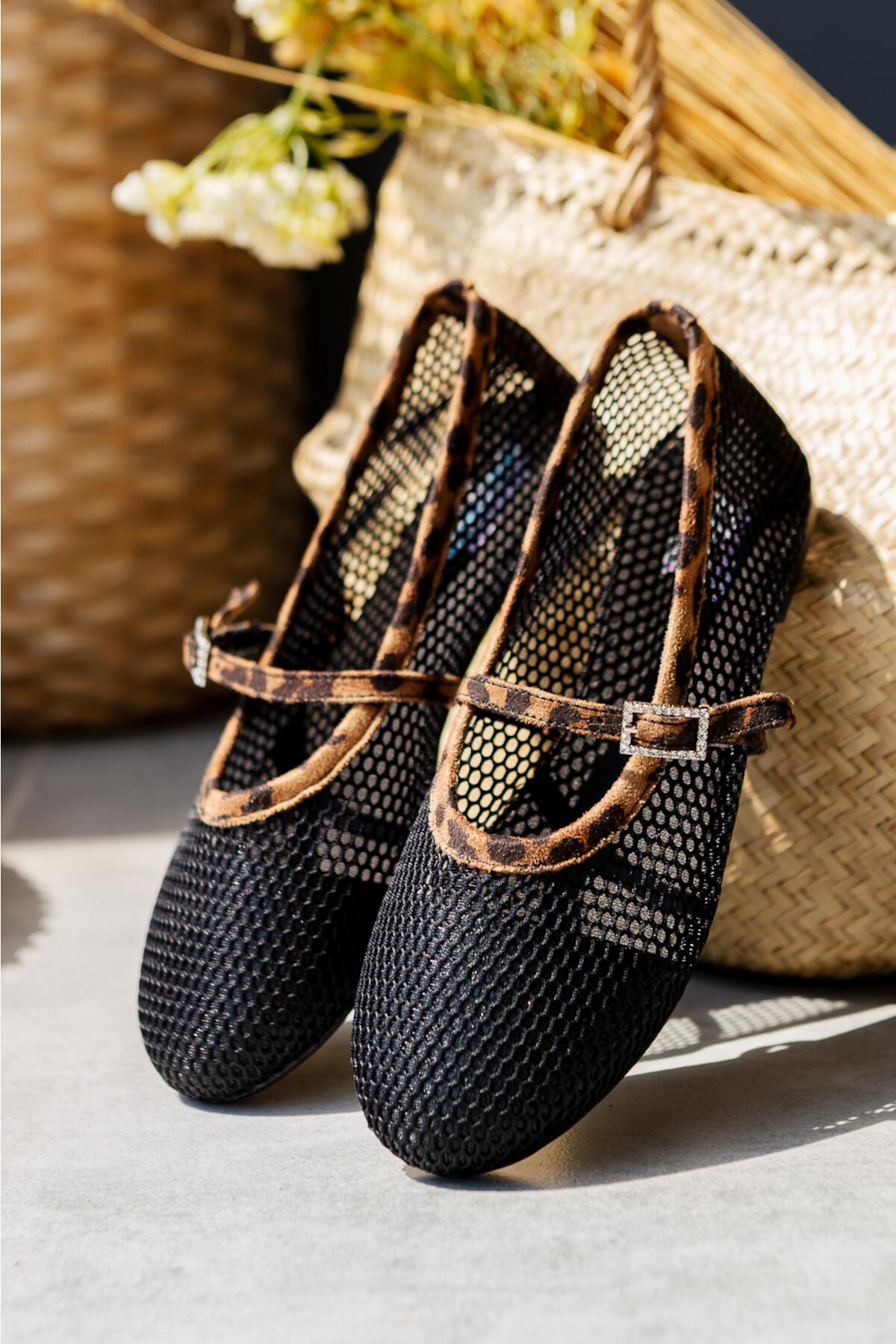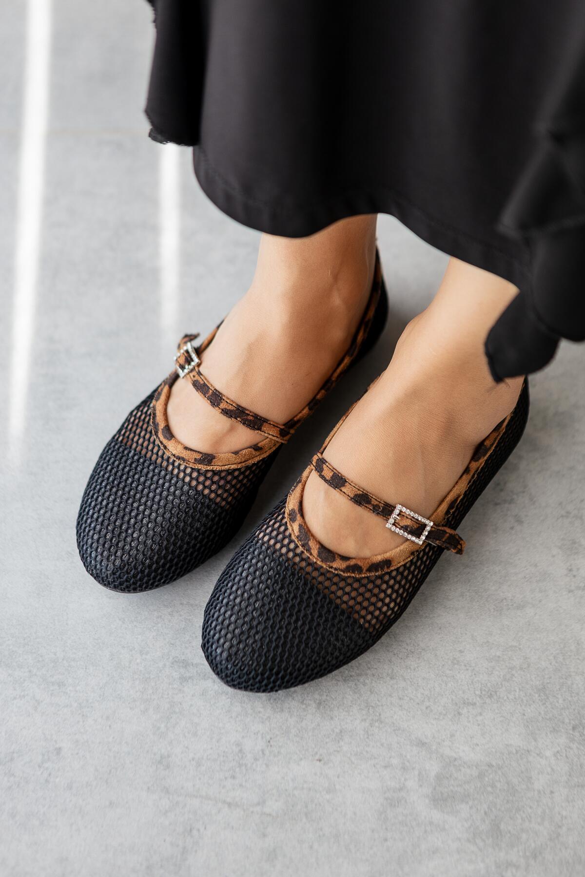 Leona Siyah Leopar Desenli Tokalı File Babet Ortopedik Memory Flex Hafızalı Taban Siyah