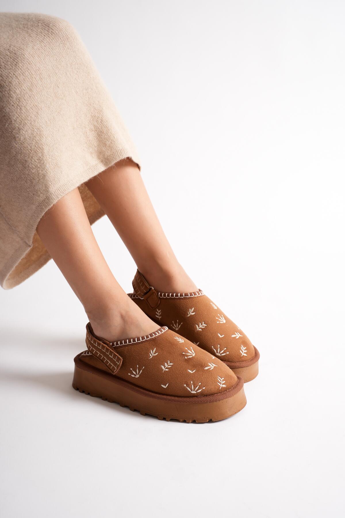 Içı Kürklü Nakişli Ultra Mini Süet Kışlık Taban Bot & Bootie Taba