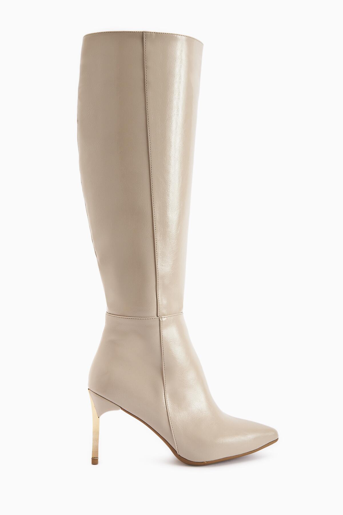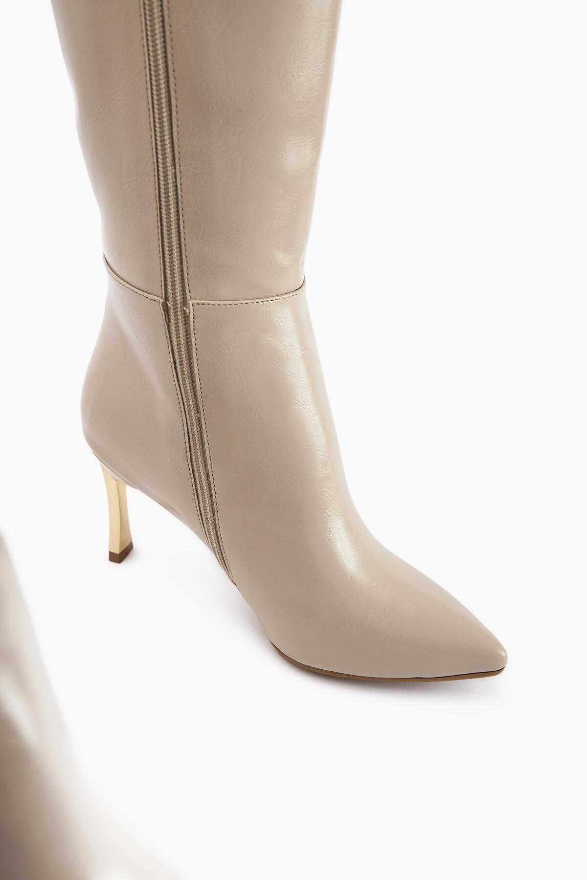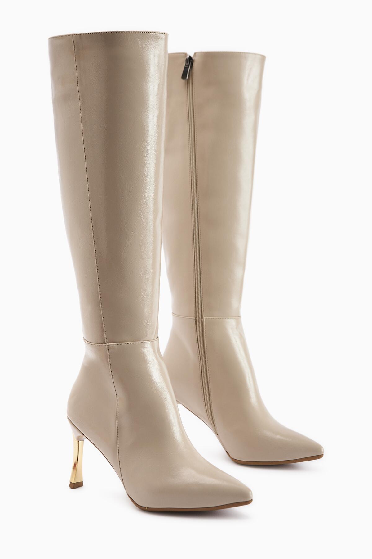 Kadın Fermuarlı Diz Altı Boy Altin Topuklu Çizme Bej