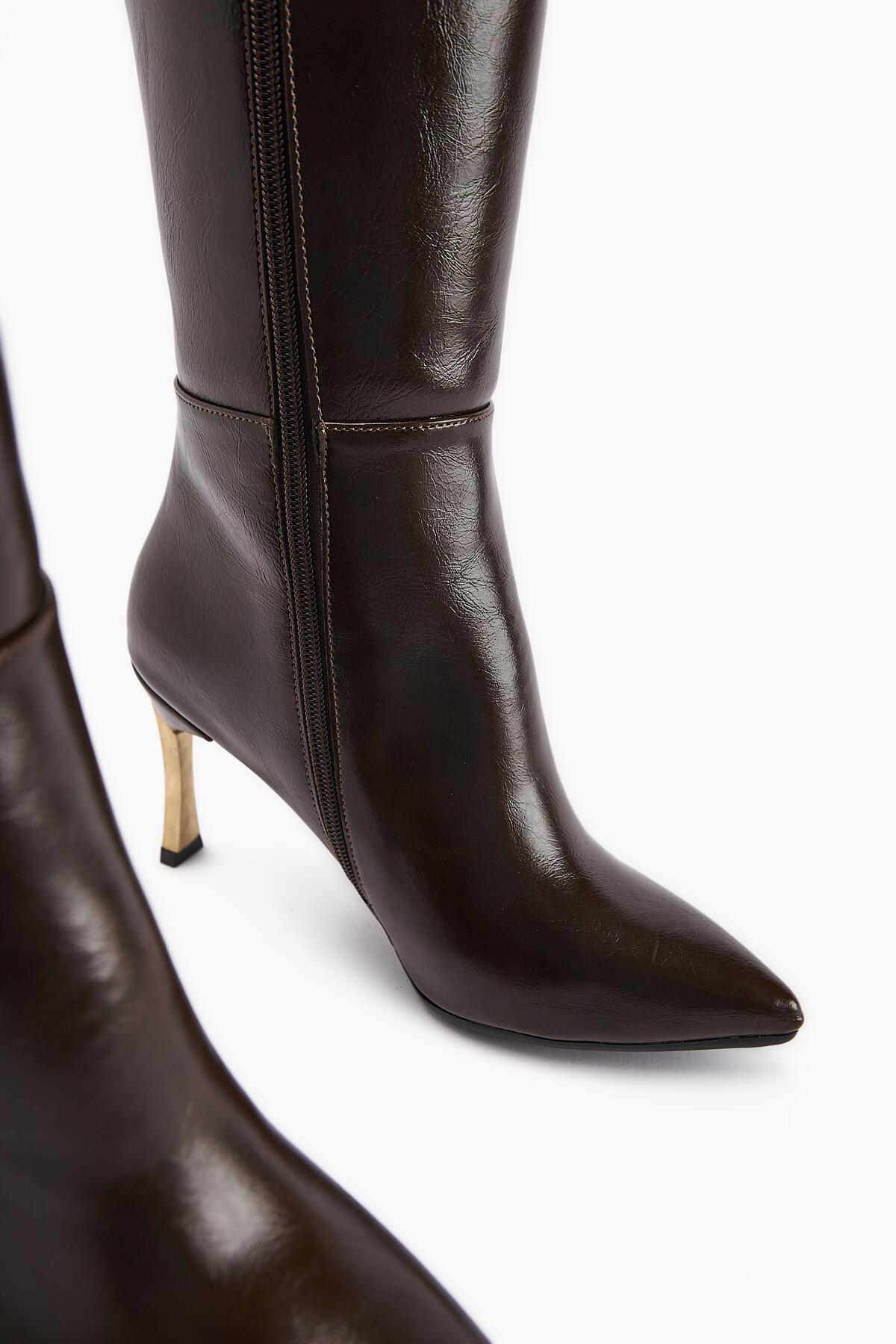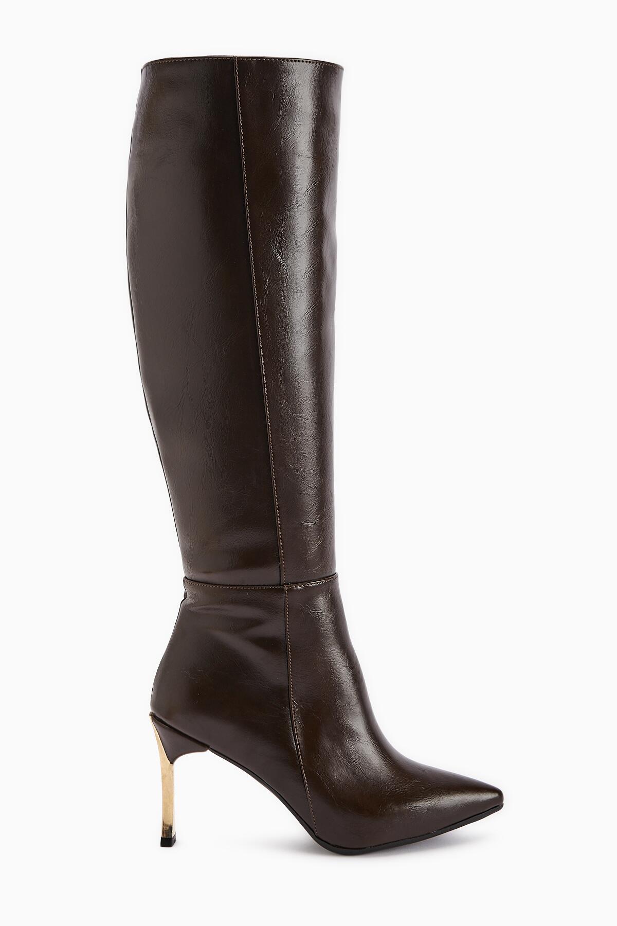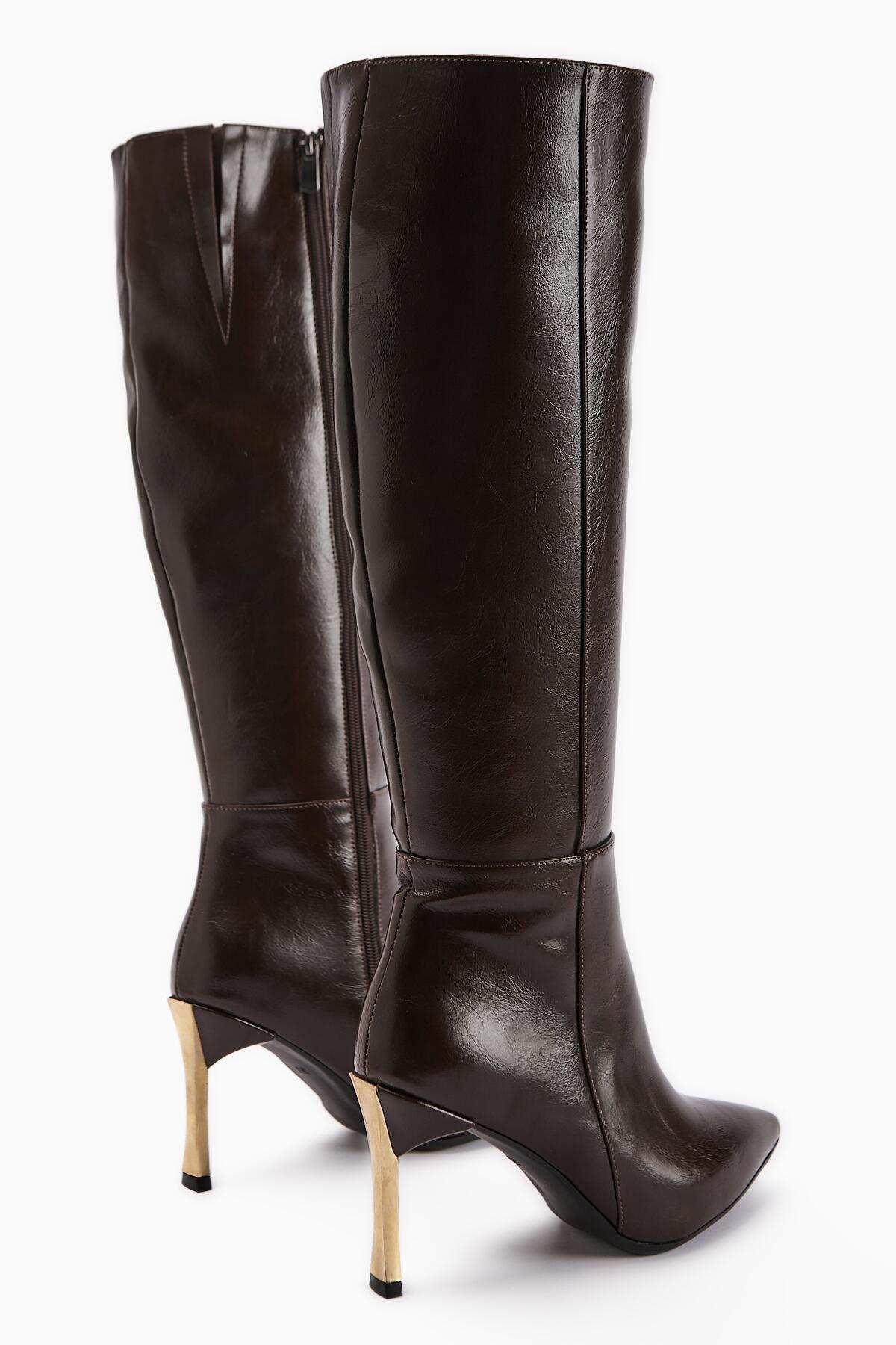 Kadın Fermuarlı Diz Altı Boy Altin Topuklu Çizme Koyu Kahverengi