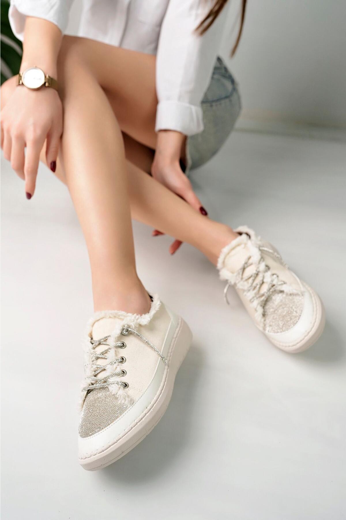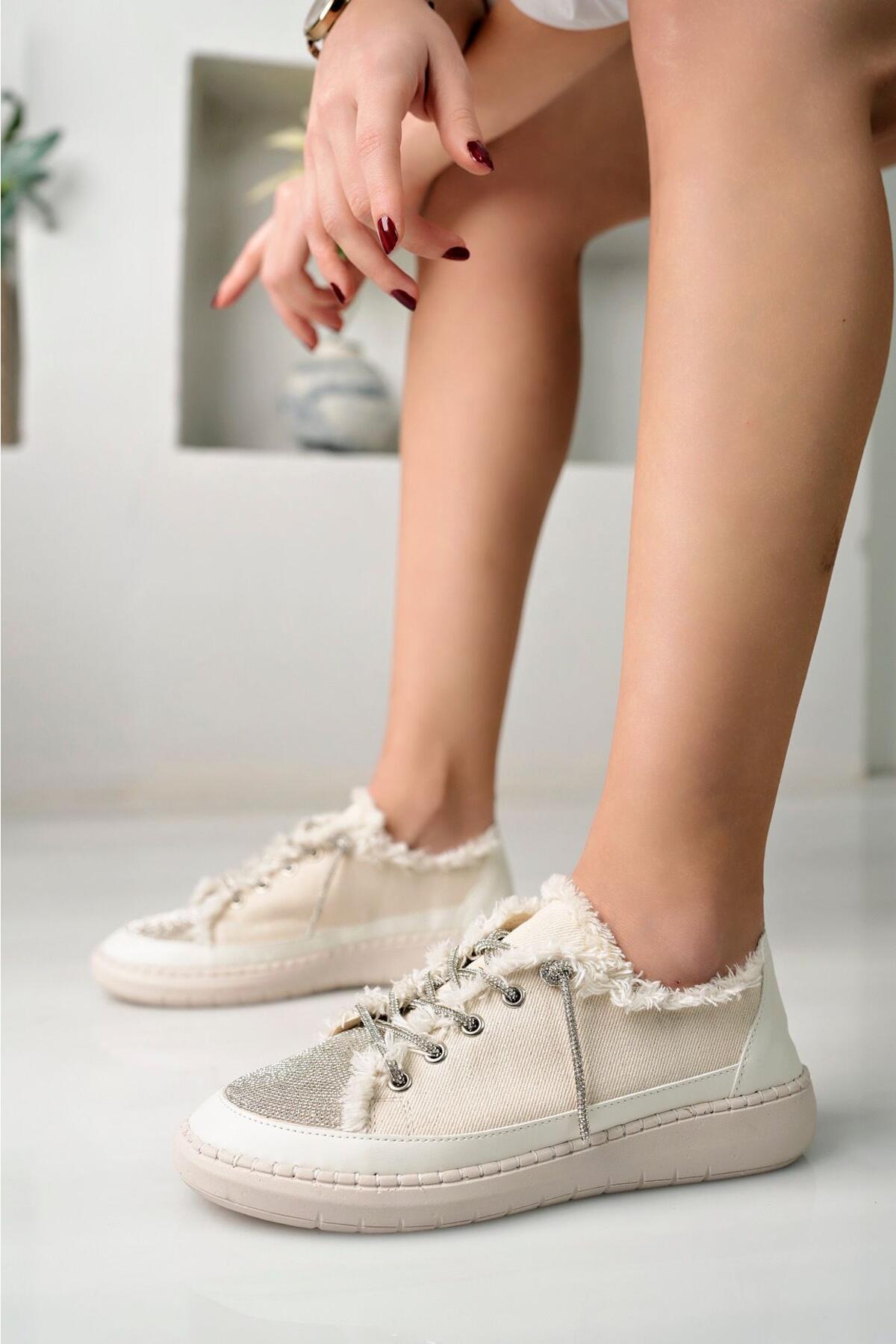 Neva Taşlı Düz Taban Kadın Kot Sneakers Krem