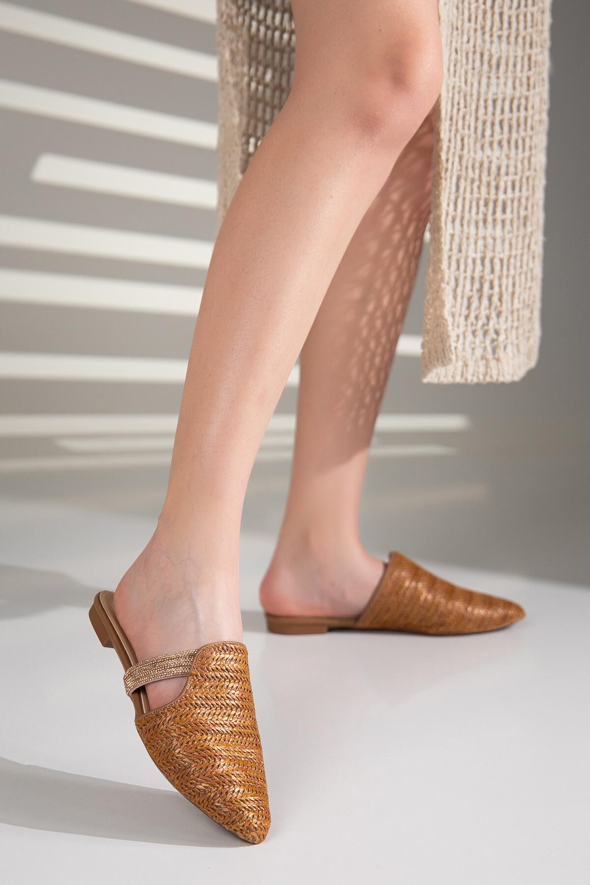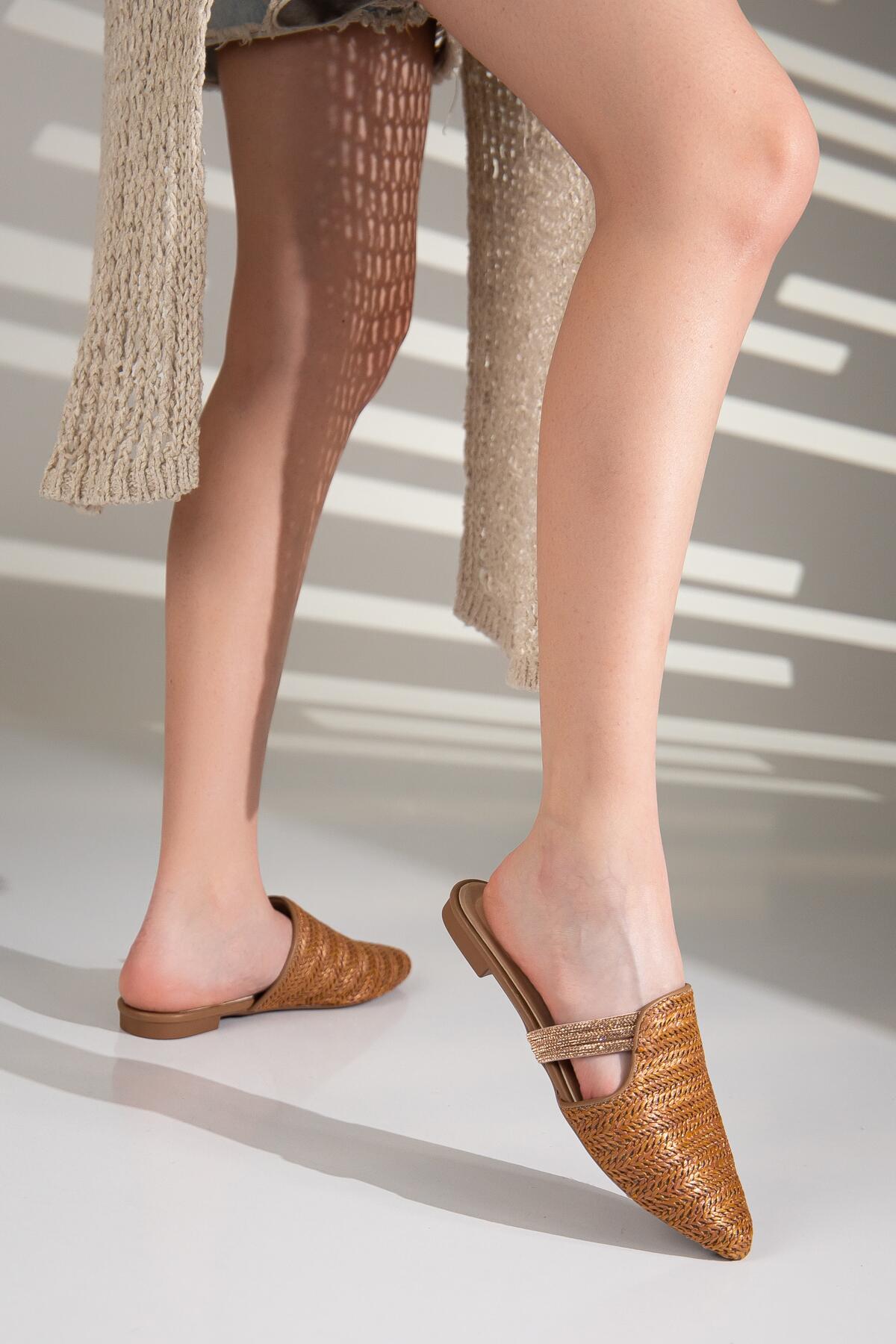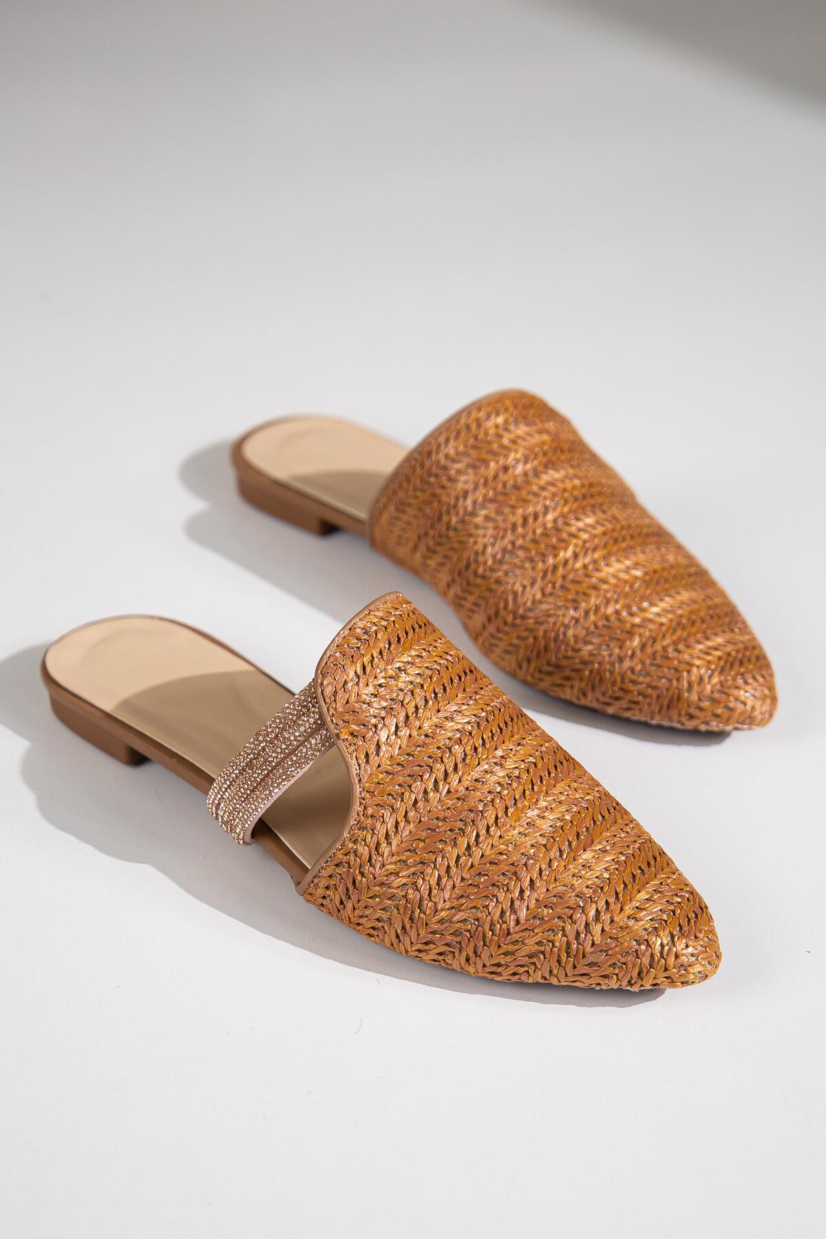 Velon Günlük Taş Detaylı Hasır Terlik Taba