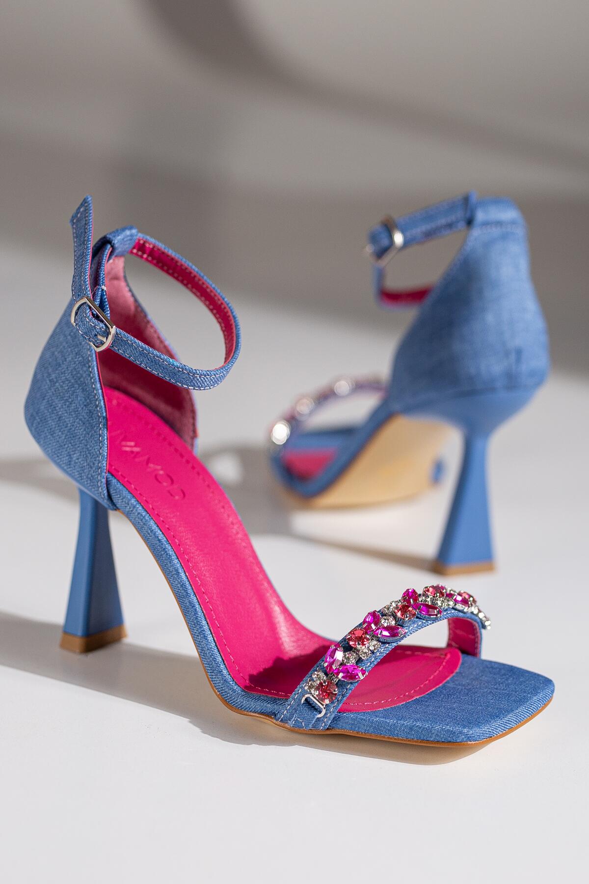 Casmina Mavi Kot Yaprak Taşlı Tek Bant Topuklu Ayakkabı Fuşya