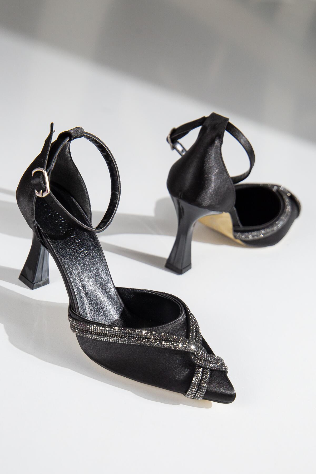 Zati Taş Detaylı Saten Topuklu Ayakkabı Siyah